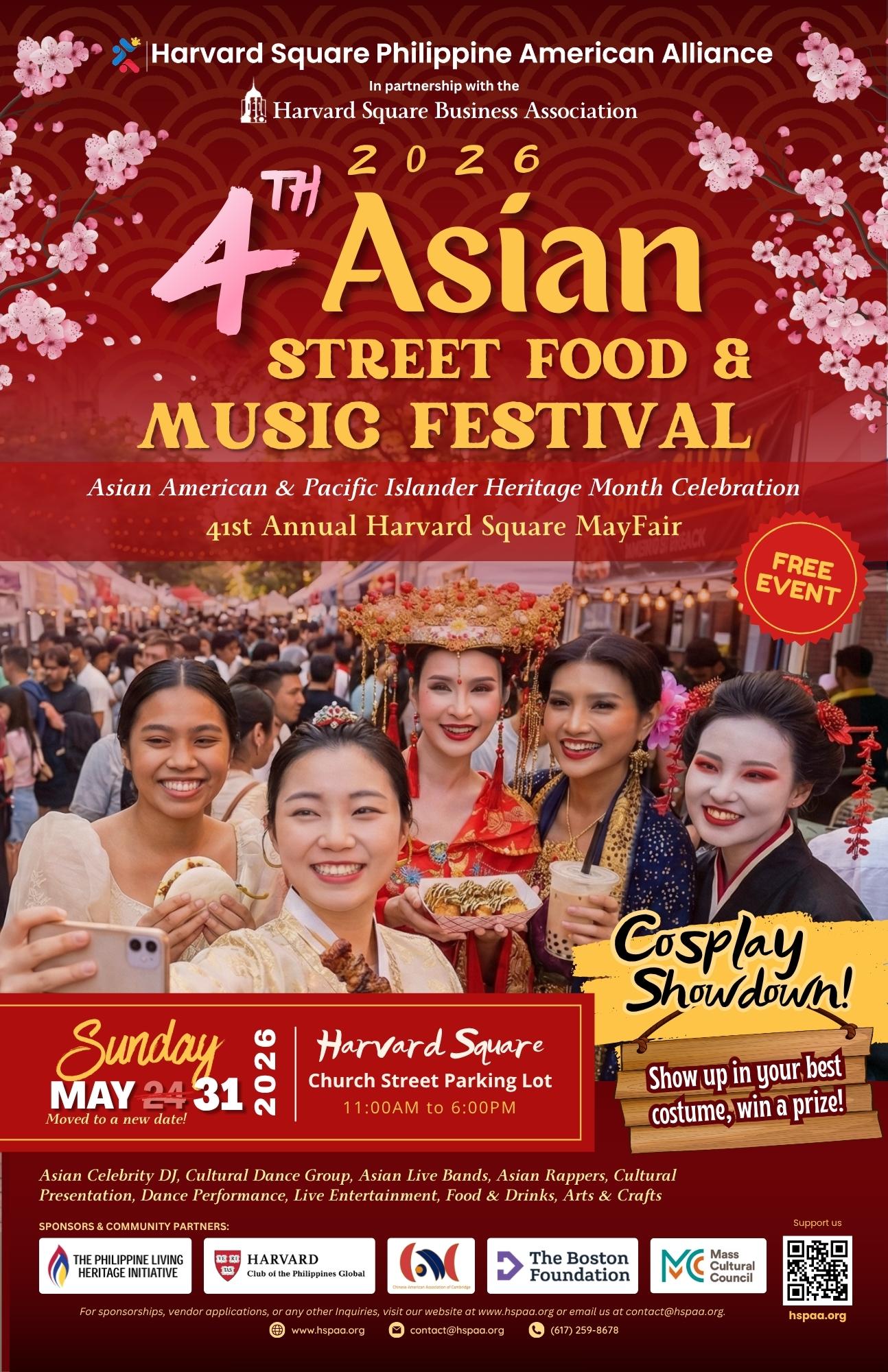 The Asian Street Food and Music Festival is one of the annual events of the Harvard Square Philippine American Alliance and it is intended to bring the Asian American community together by showcasing a panorama of our rich heritage and traditions through music, dance, and food to the local community. In partnership with the Harvard Square Business Association’s Annual Mayfair celebration, this event will feature live music on multiple stages from different eras catering to a multi-generational crowd, international vendors of crafts and items including those uniquely from Asia, and festive beer gardens from both local and international businesses. Come spend your weekend learning more about our rich Asian culture with your family and friends, while enjoying good food and music at the heart of Cambridge.